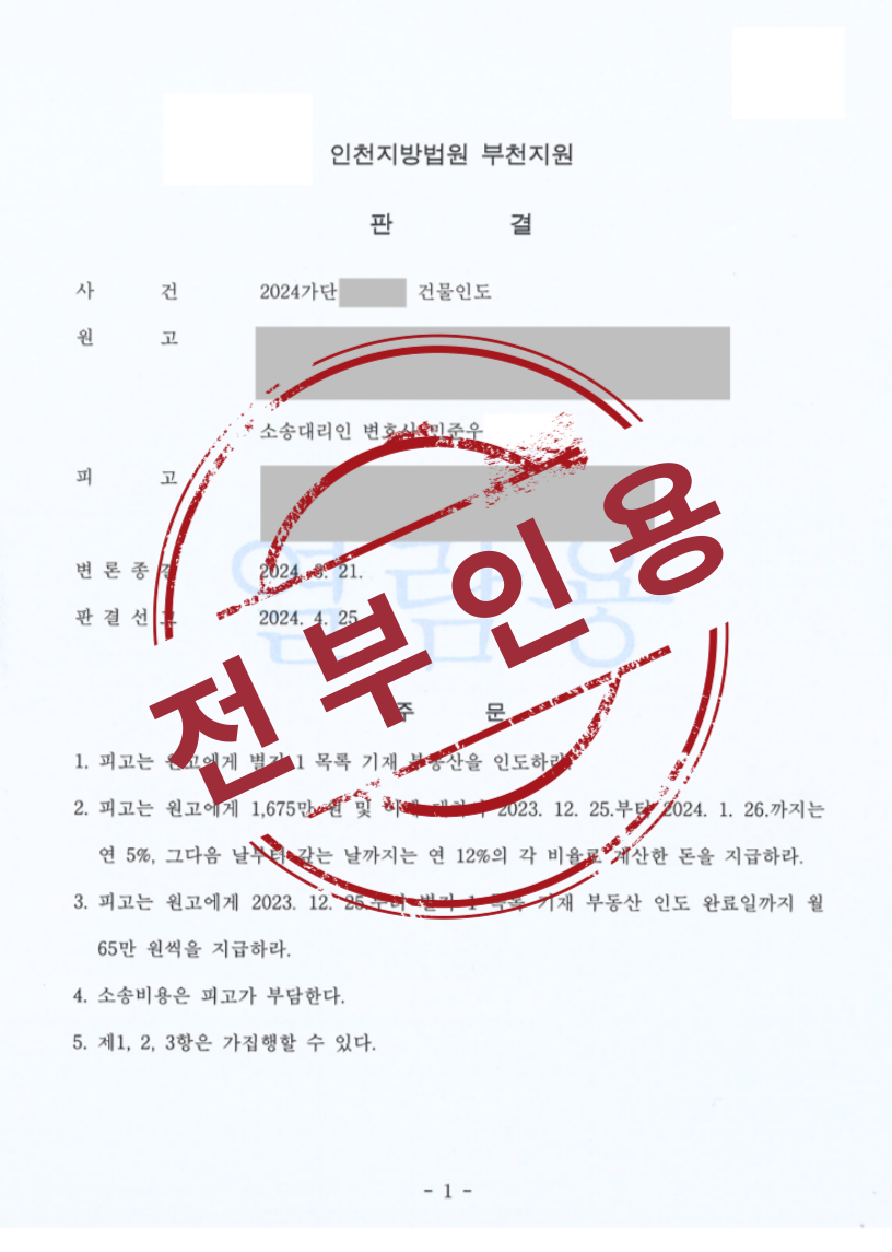 법원은 민 변호사의 법리 구성과 증거에 따라 임대인의 청구를 모두 인용하였고, 이후 민 변호사는 신속히 강제집행 절차를 진행하여 의뢰인의 실질적인 점유 회복까지 마무리할 수 있었습니다.