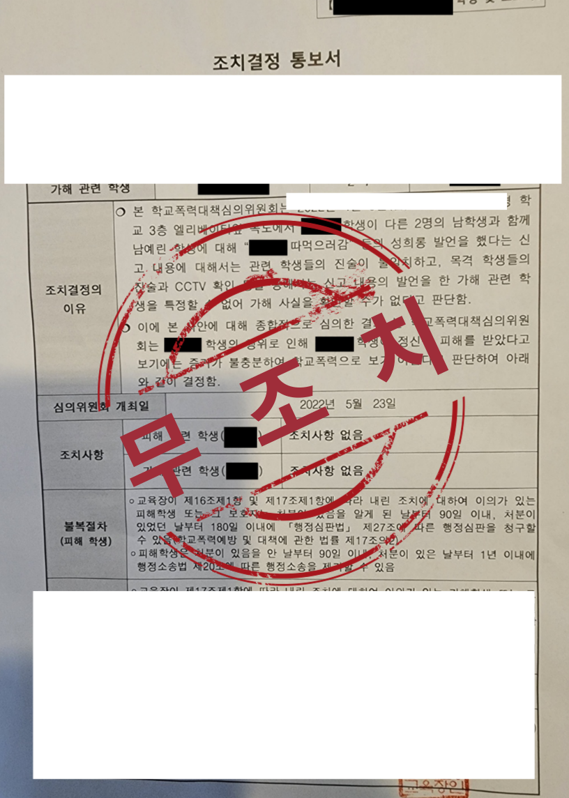 성희롱 가해자로 오해받은 중학생, 무조치로 마무리된 학교폭력 심의 사례